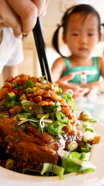 餓扁的'' 蘋果 '' 瞪大的小眼睛看著桌上的 ''椒麻雞''