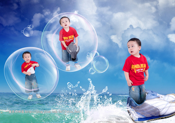 畫面故事性 : 小孩乘著自己的球鞋快艇愉快的乘風破浪,呈現無憂無慮的意境!